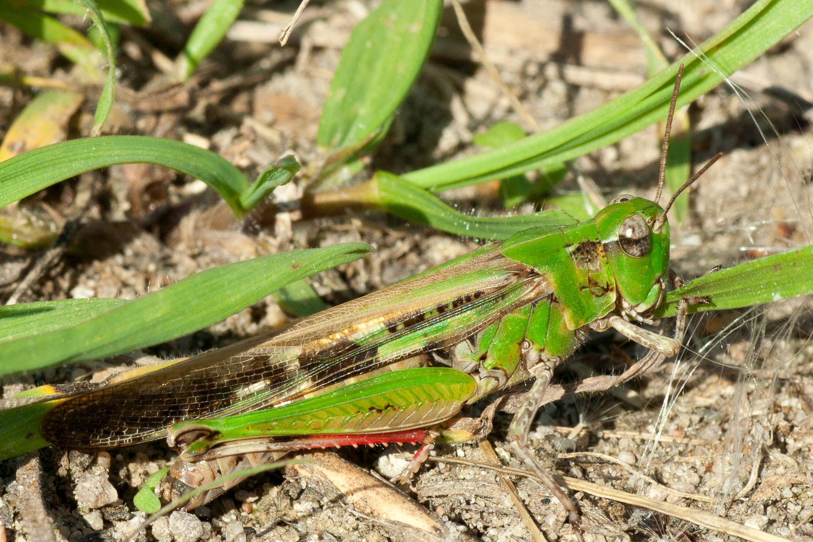 Abb. 6: Die stark gefährdete Grüne Strandschrecke (Aiolopus thalassinus) profitiert besonders von Konik-Pferden in den Marchauen. Durch die Einführung der Beweidung ist die Landschaft nämlich wieder viel klein-strukturierter und bietet viele unterschiedliche Lebensräume auf kleinem Raum, so sind z. B. neben dichtwüchsigen feuchten Senken in unmittelbarer Nähe kurzrasige Sandrasen entstanden. (Foto: Dariusz Kowalczyk)