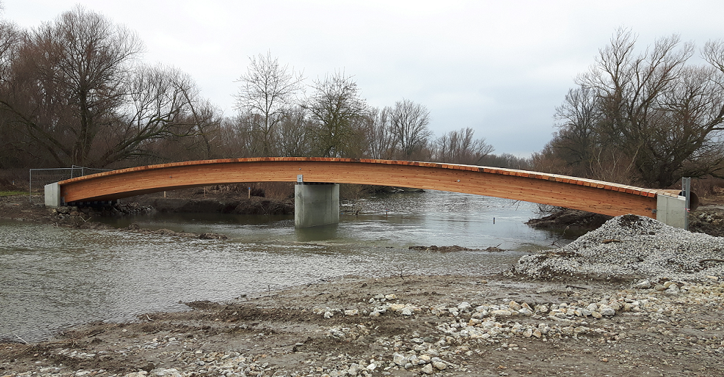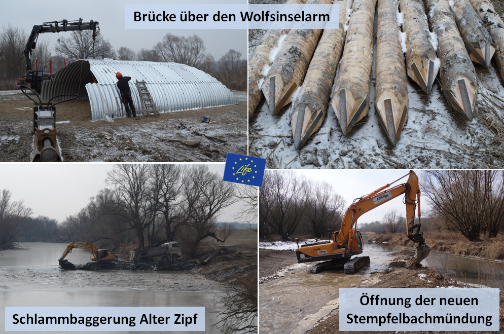 Es ist so weit. Nach intensiven Arbeiten konnte das Altarmsystem im Mündungsbereich samt der neuen Stempfelbachmündung fertiggestellt werden. Der Seitenarm „Alter Zipf“ wird seit 7. März durchströmt. Bei dem Seitenarm „Wolfsseeinsel“ konnte die Brücke aus Wellstahl fertig gestellt werden und der Seitenarm wird seit 12. März durchströmt. In den nächsten Tagen finden noch Restarbeiten statt und danach ist die 1. Bauphase der Wasserbaumaßnahmen des Life Projekts abgeschlossen.
