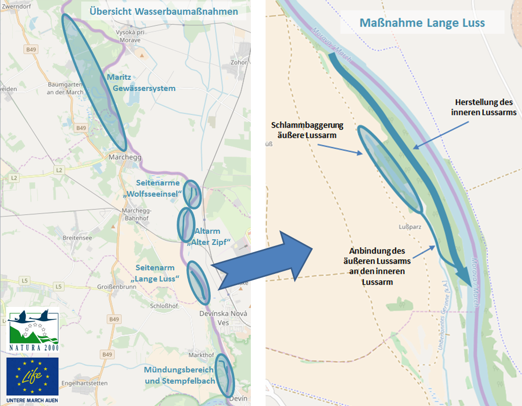 Das LIFE Projekt, welches von viadonau gemeinsam mit dem WWF und dem NÖ Landesfischereiverband durchgeführt wird, geht in die zweite Runde. In den kommenden Monaten wird das WWF Auenreservat durch einzelne gezielte Maßnahmen am sogenannten Maritz Gewässersystem wieder besser mit der March vernetzt und damit mit lebensnotwendigem Wasser versorgt. Dafür werden Uferverbauungen abgesenkt und Schlamm und Sand weggebaggert. Franz Steiner, Projektleiter der viadonau, ergänzt: „Weiters wird südlich von Marchegg an der Langen Luss ein neuer, ca. zwei km langer Seitenarm entstehen, der bei der Marchregulierung im 20. Jahrhundert abgeschnitten wurde und seit dem völlig verlandet ist. Zusätzlich wird ein weiterer bestehender Seitenarm eingetieft werden, damit hier länger Wasser verfügbar ist.“