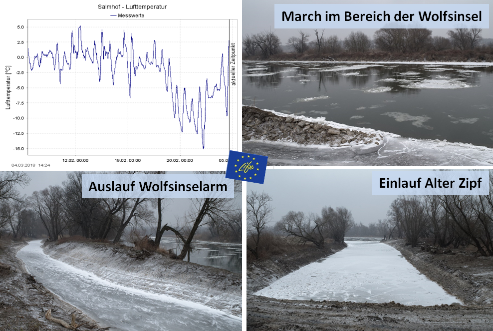 Der Februar endete mit tiefen Temperaturen. Tagestemperaturen unter -5° Celsius über eine Woche führten zu einem beeindruckendem Eistreiben an der March und vollständig zugefroren neuen Seitenarmen.
